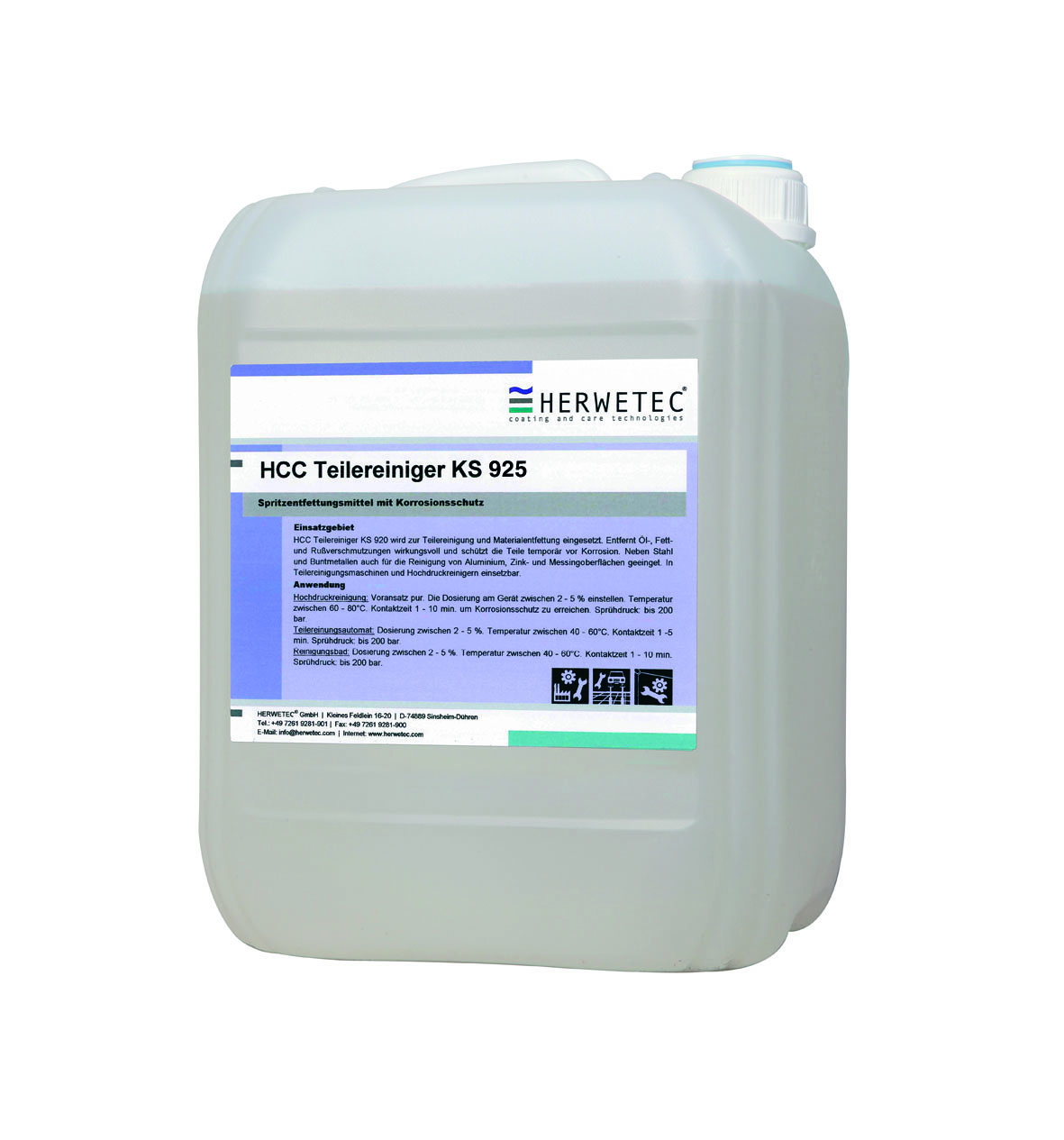 HCC Teilereinigung KS 925 wird in der Industrie, in Autohäusern und in Instandsetzungsbetrieben zur Teilereinigung und Materialentfettung eingesetzt. HCC Teilereiniger KS 925 ist für Teilereinigungsmaschinen und Hochdruckreiniger geeignet. HCC Teilereiniger KS 925ist schaumarm eingestellt und frei von Nitrit und Halogenkohlenwasserstoffen. Er entfernt Öl-, Fett-und Rußverschmutzungen von Metallteilen und schützt temporär vor Korrosion. HCC Teilereiniger KS 925 ist materialschonend und neben Stahl und Buntmetallen auch für die Reinigung von Aluminium-, Zink-und Messingoberflächen geeignet. pH-Wert im Konzentrat: ca. 10
